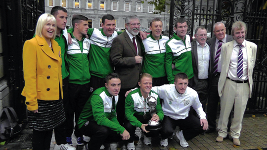 The Irish squad was invited to Leinster House by Sinn Fein where they were honoured at a special reception at which a presentation was made to goalkeeper David Byrne.