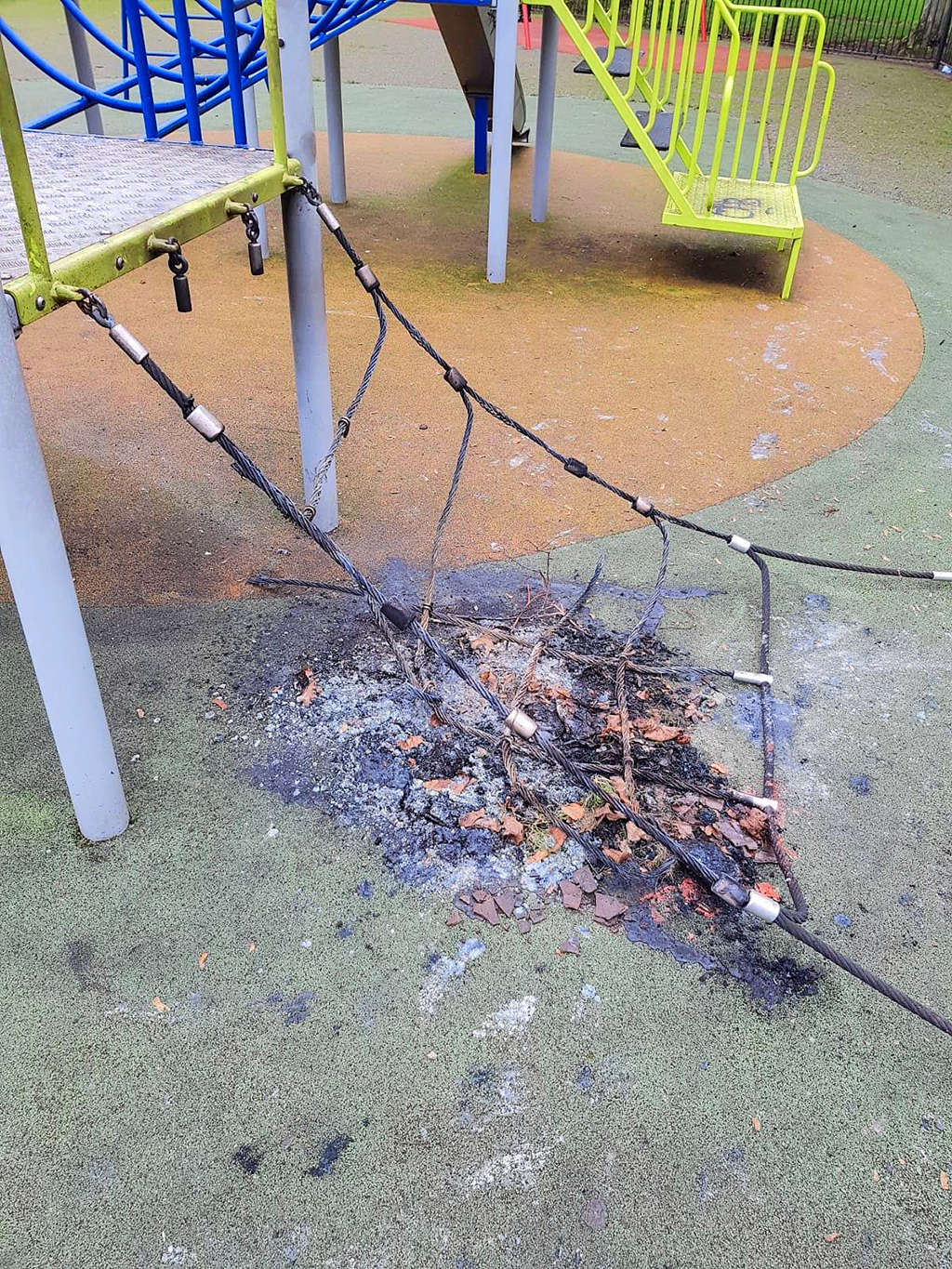 Photos received by Northside People show graffiti, broken play equipment and fire damage to the Ellenfield Park playground in Whitehall.