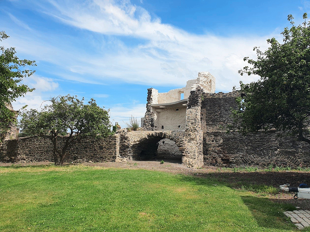 The remains of Swords Castle today consist of a large, four-sided partly battlemented curtain wall, approximately four metres high, containing several mural buildings and structures, including the entrance gatehouse, the restored chapel and constables tower and the semi-ruined east tower.