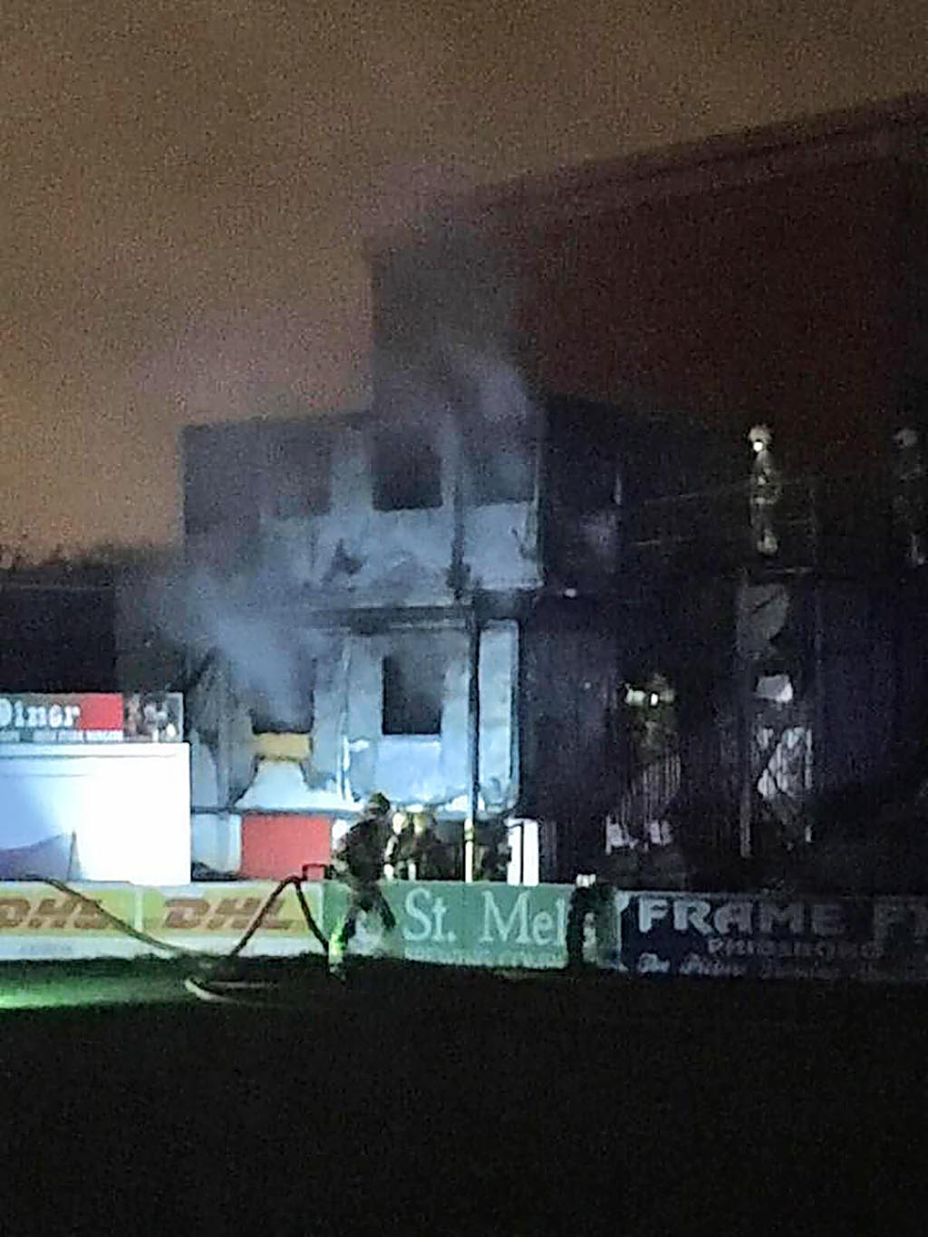The portocabins were totally destroyed in the incident, but the fire had been contained and the rest of the stadium was undamaged.