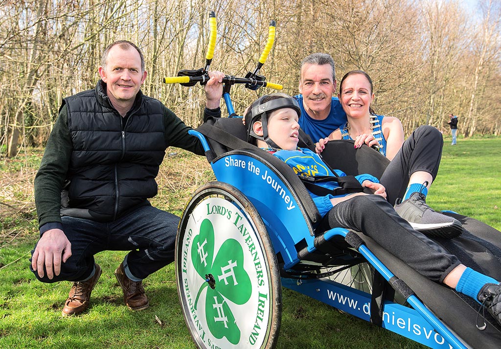 Ken Brennan, the director of Lord’s Taverners Ireland, is pictured with Daniel Tighe with his parents Keith and Sinead Tighe at the presentation of the running chair.