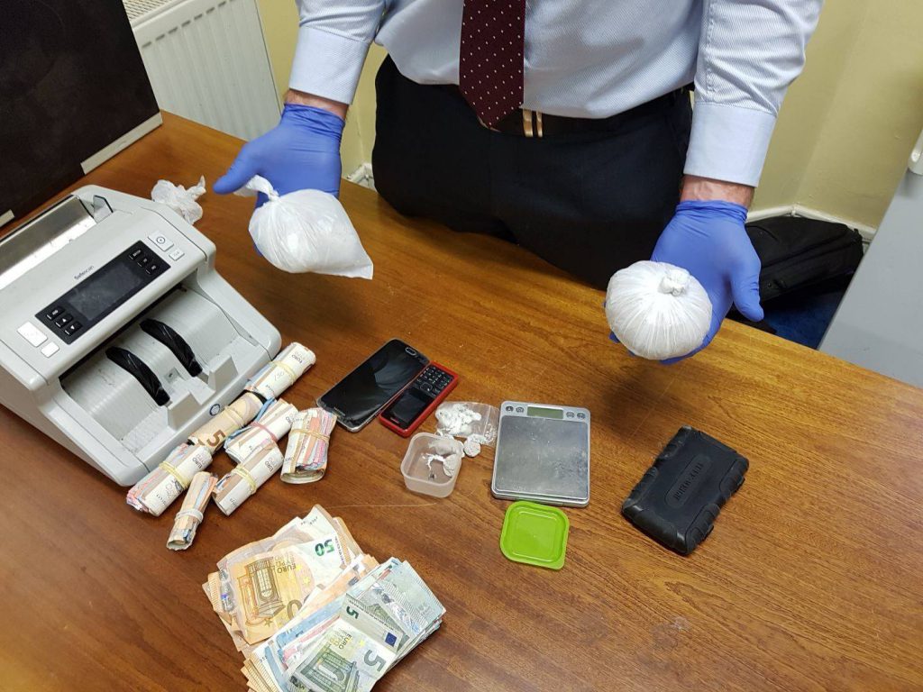A premises was searched yesterday morning and cocaine and heroin was seized with a combined estimated street value of €60,000. Cash totalling €10,000 was also recovered along with drug paraphernalia, fraudulent passports and other documentation of interest.